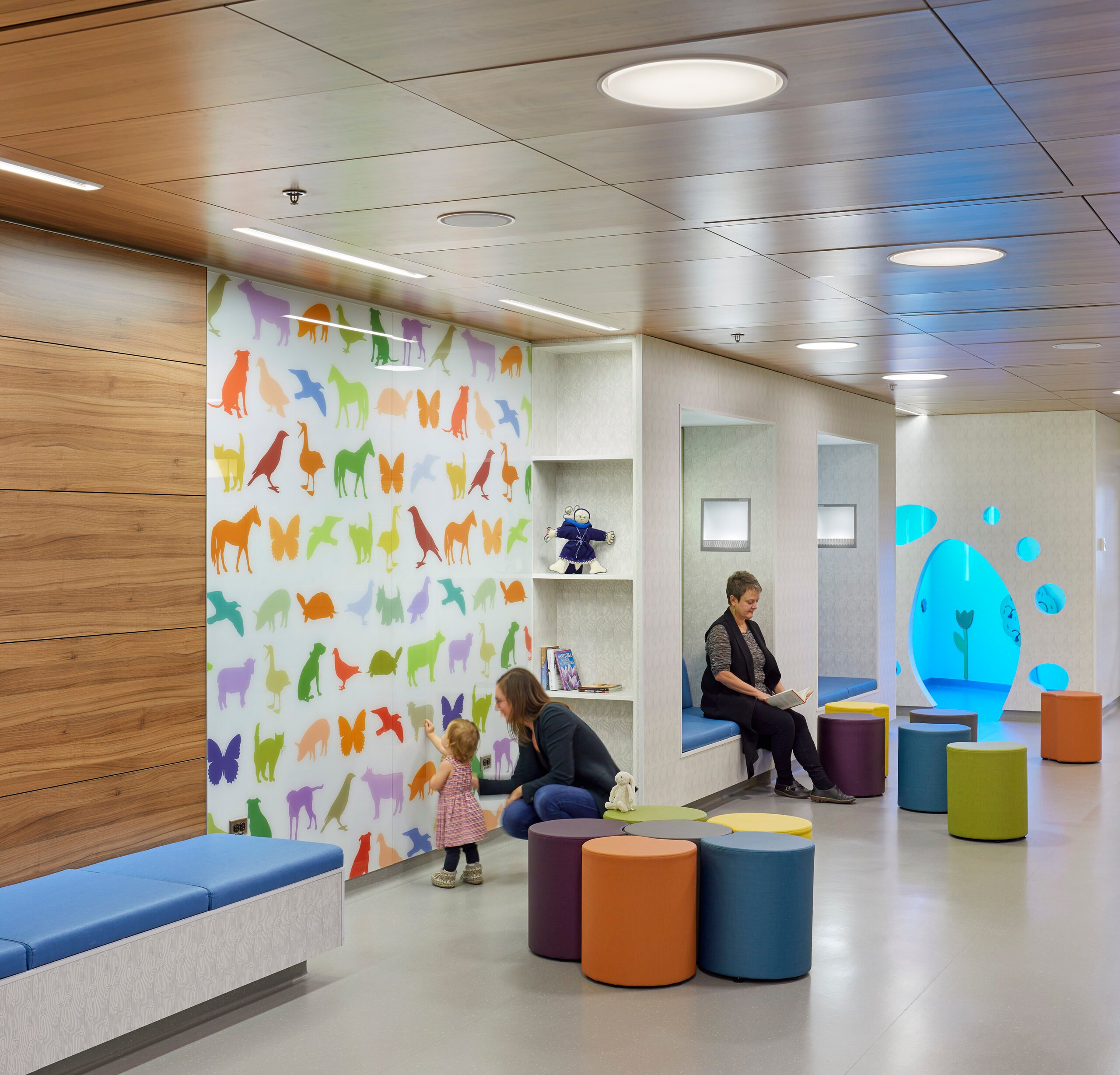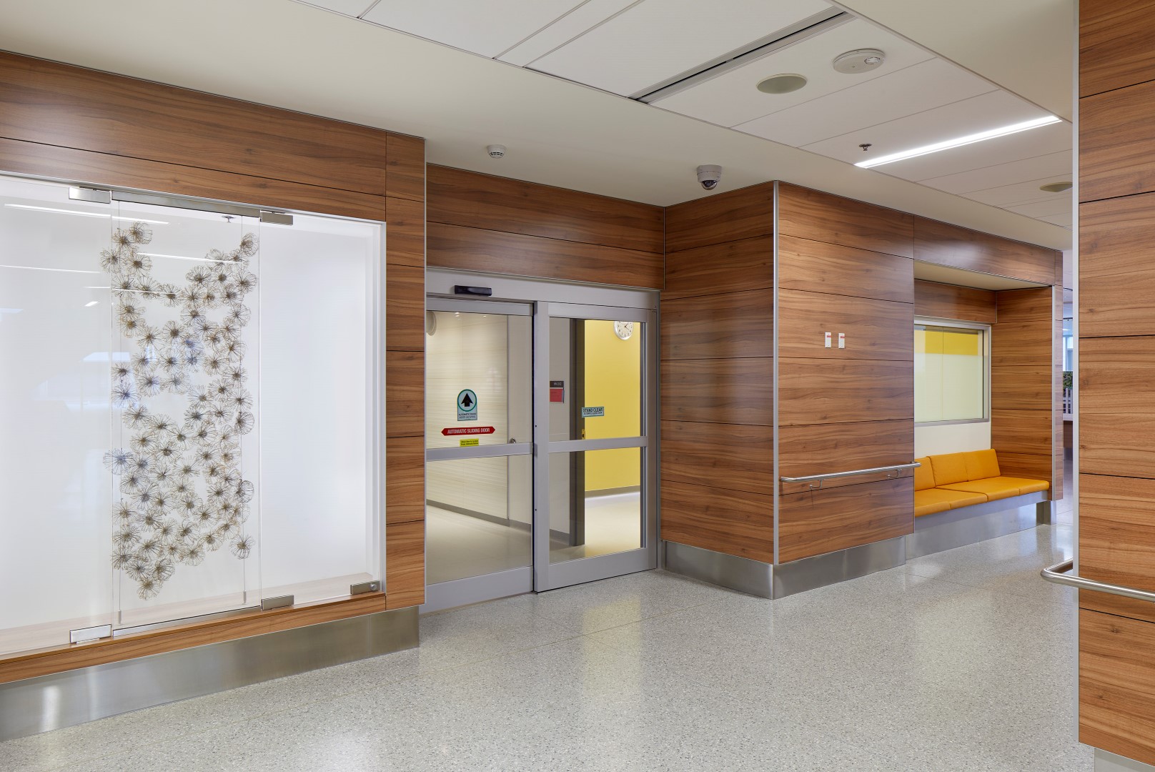 Clinical programs here are a consolidation of women and children’s health services from multiple locations into one comprehensive facility. Bringing these services under one roof enables improvements in the quality of care for newborns and provides a more streamlined experience for patients. The Women’s Triage Facility, large specialty ultrasound suite, flexible obstetrics and gynecology ambulatory care clinics, gynecology perioperative center, and inpatient unit provide a full range of services for women, both before and after childbirth.